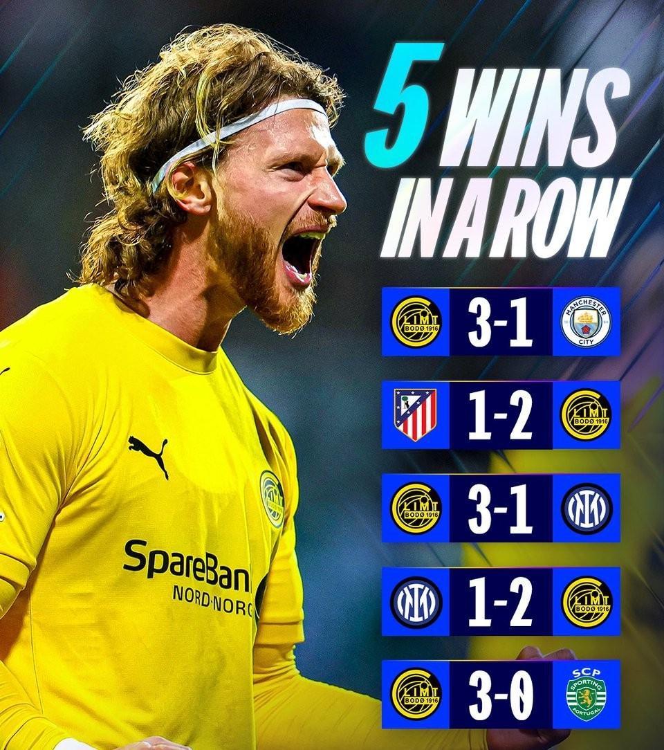 在剩余的一场欧冠比赛中,本赛季的大黑马挪超霸主博德闪耀主场3比0拿下葡萄牙体育,豪取欧冠5连胜。