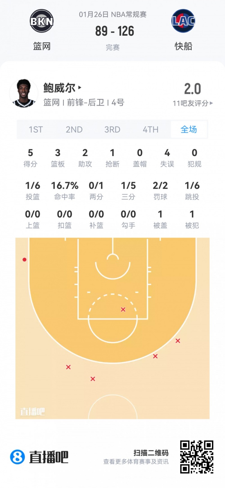 V体育网站-【菜鸟】克利福德15分 篮网两人得分上双 科比·桑德斯9分4板2助